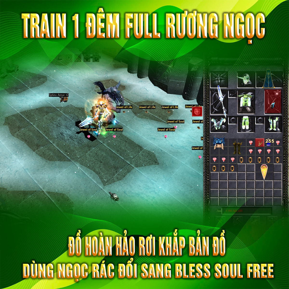 ● Cách sở hữu: Dùng 1 Đá nguyên thủy + 1Bless + 1Soul đến gặp NPC Trade trong bar loren để đổi FREE (tỉ lệ đổi max 5% sang DTH)